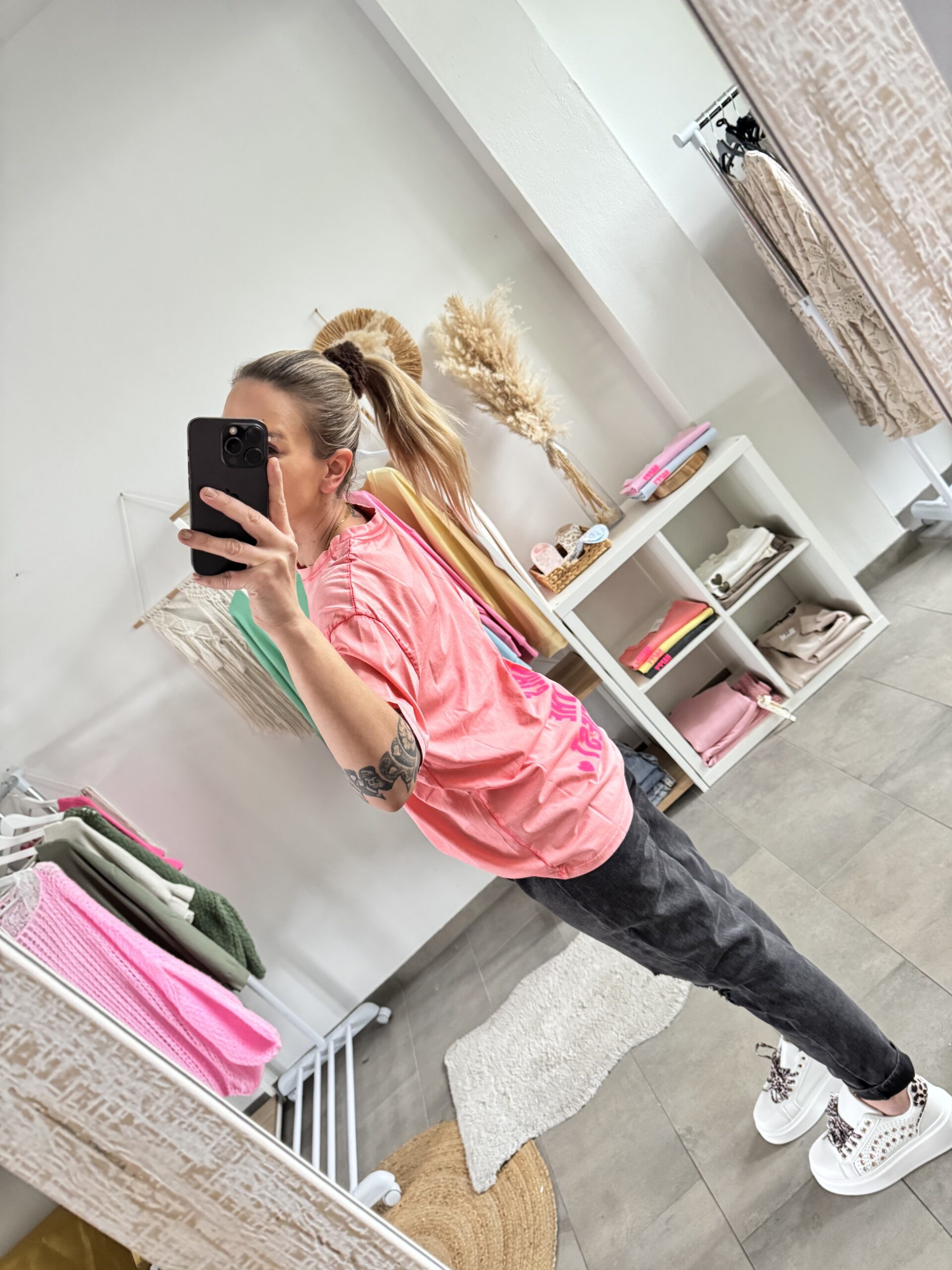 LIMITED EDITION: plussizegeeignet PR03 Statement Shirt im hochwertigen Washed Look „Happy girls are the prettiest“