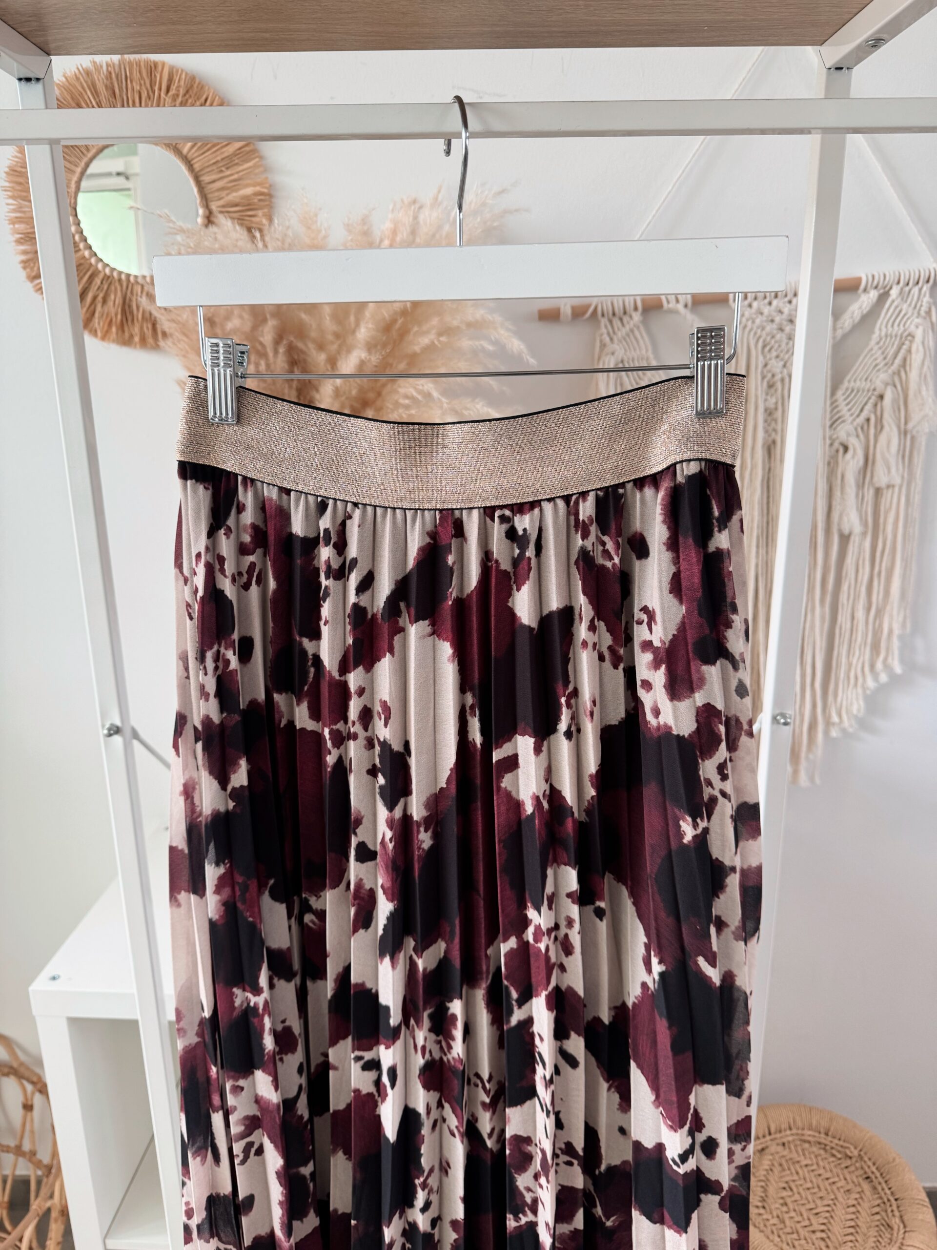 Ein Rock zum Verlieben! 💕 Der fließende Stoff mit abstraktem Muster in Bordeaux, Schwarz & Beige macht ihn zu einem echten Hingucker. Die feinen Plisseefalten zaubern eine feminine Silhouette, während der elastische Glitzerbund für Komfort und ein edles Detail sorgt. Perfekt für Alltag & besondere Anlässe!