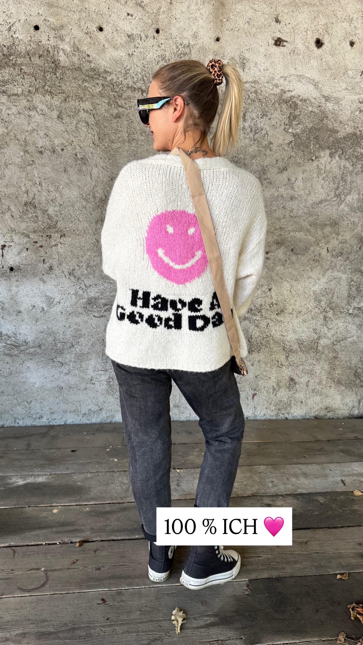 Ein Cardigan, der sofort gute Laune macht 🌸 Mit dem großen Smiley auf dem Rücken und der Botschaft „Have a good day“zaubert er dir (und allen um dich herum) ein Lächeln ins Gesicht. Perfekt für lässige Looks und kuschelige Momente.