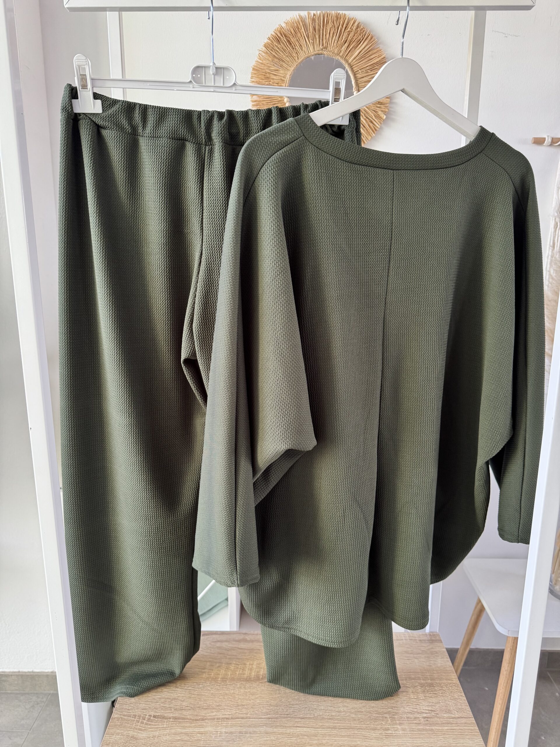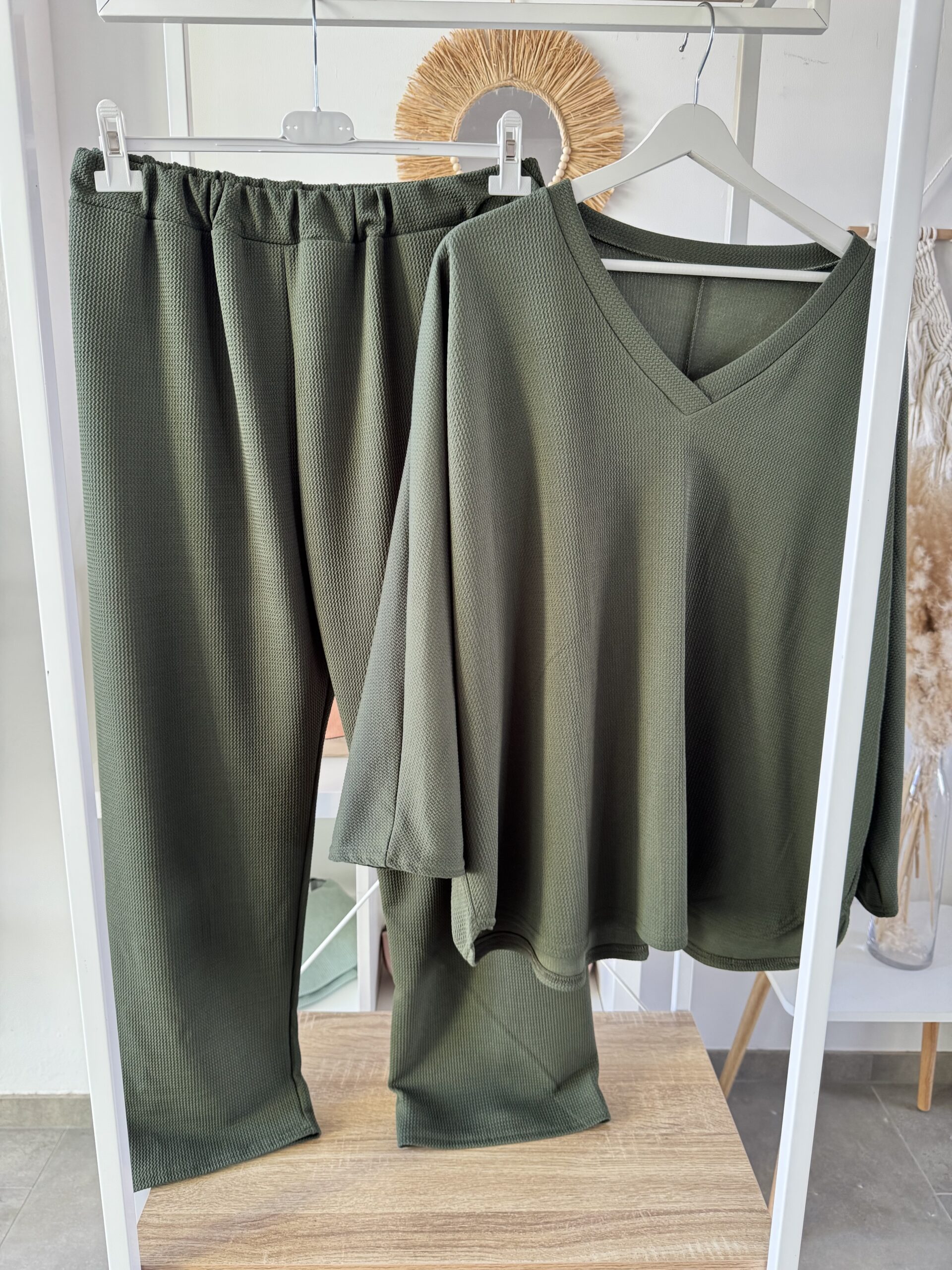 Dieses lässige Set aus V-Neck Sweater und passender Hose vereint Komfort und Stil in einer modernen Silhouette. Die gewaffelte Oberfläche sorgt für eine besondere Struktur, während der weiche Stoff angenehm auf der Haut liegt.