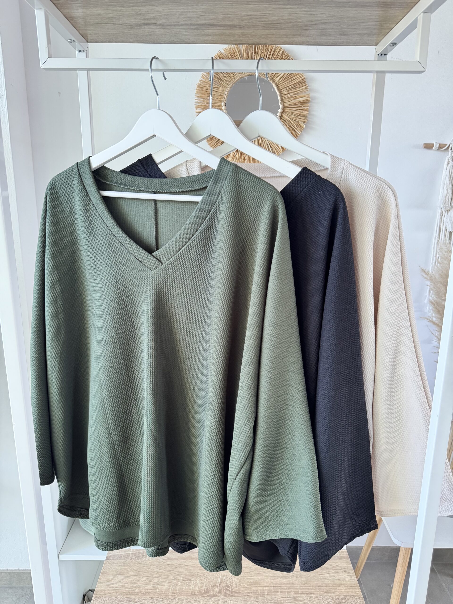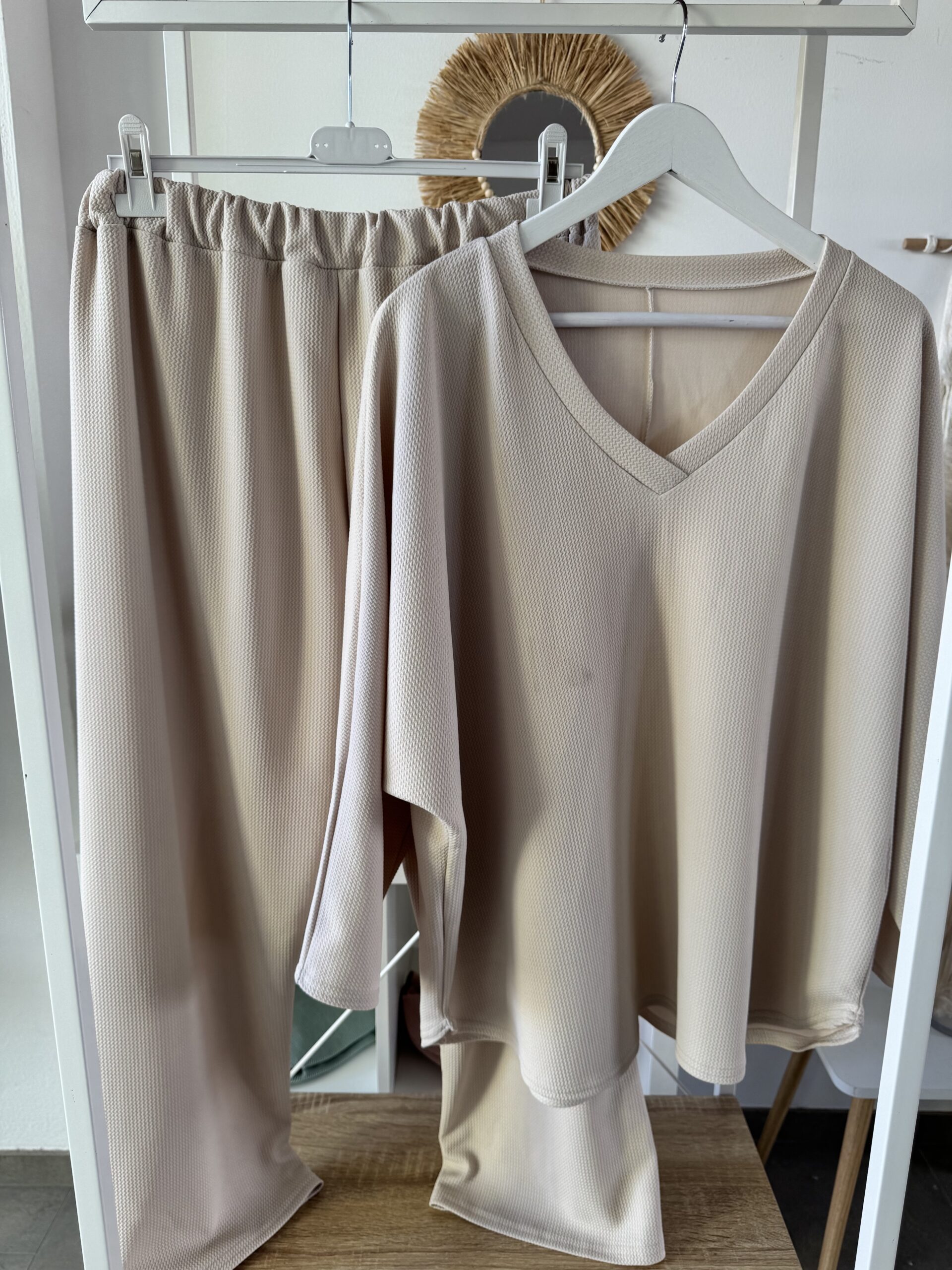 Der locker fallende Sweater mit V-Ausschnitt schenkt Leichtigkeit, die Hose mit elastischem Bund sorgt für maximalen Komfort – ohne einzuengen.