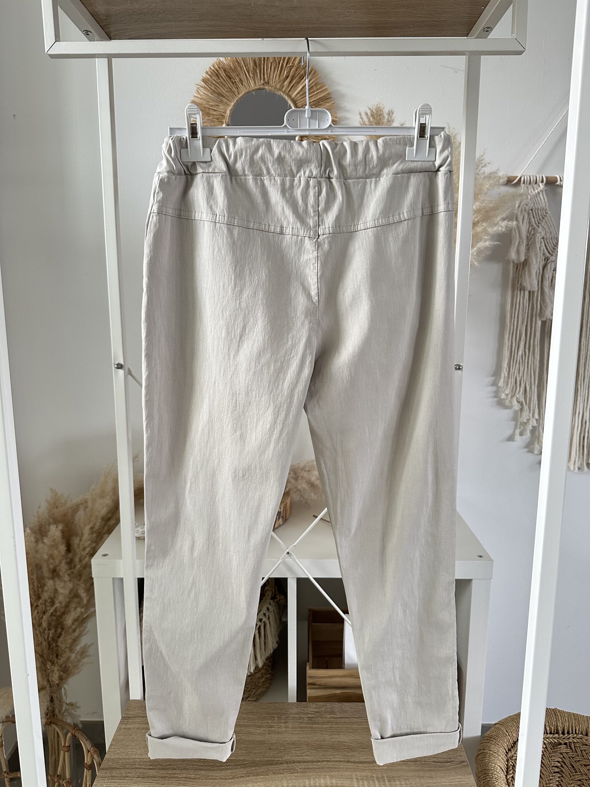 Die knitterige Baumwollhose sorgt für einen entspannten Look und fühlt sich dabei super angenehm auf der Haut an.