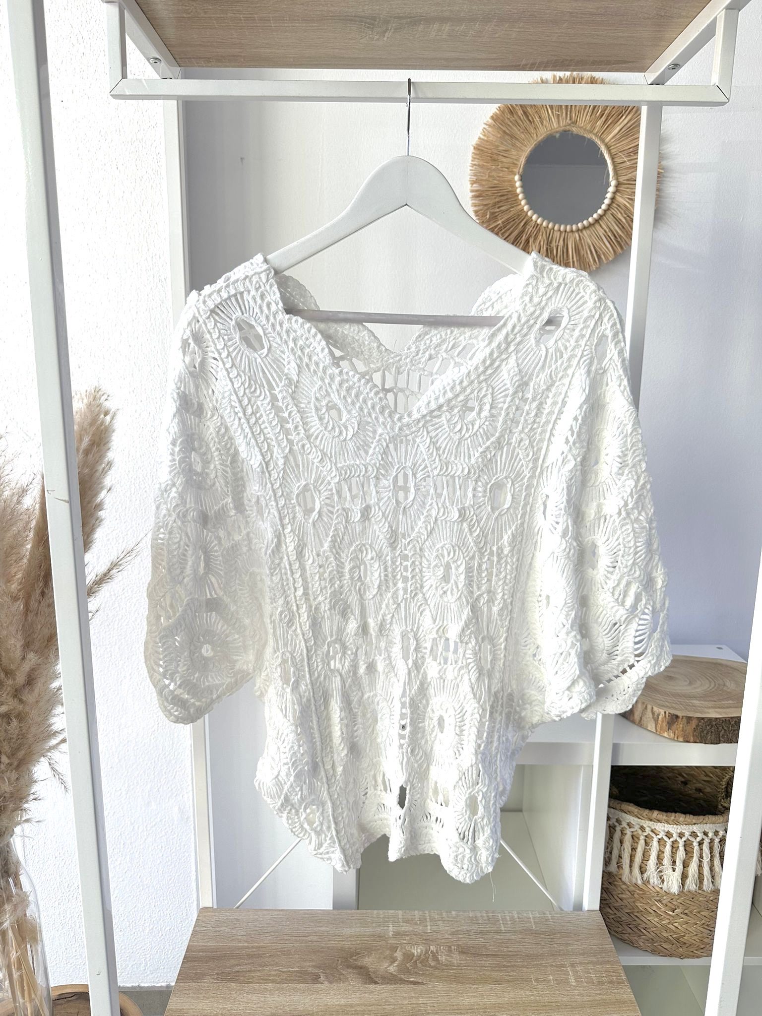 Dieser luftige Crochet-Pullover mit aufwendigem Häkelmuster bringt Leichtigkeit und Boho-Vibes in deinen Look – perfekt über Tops, Kleider oder sommerliche Outfits.