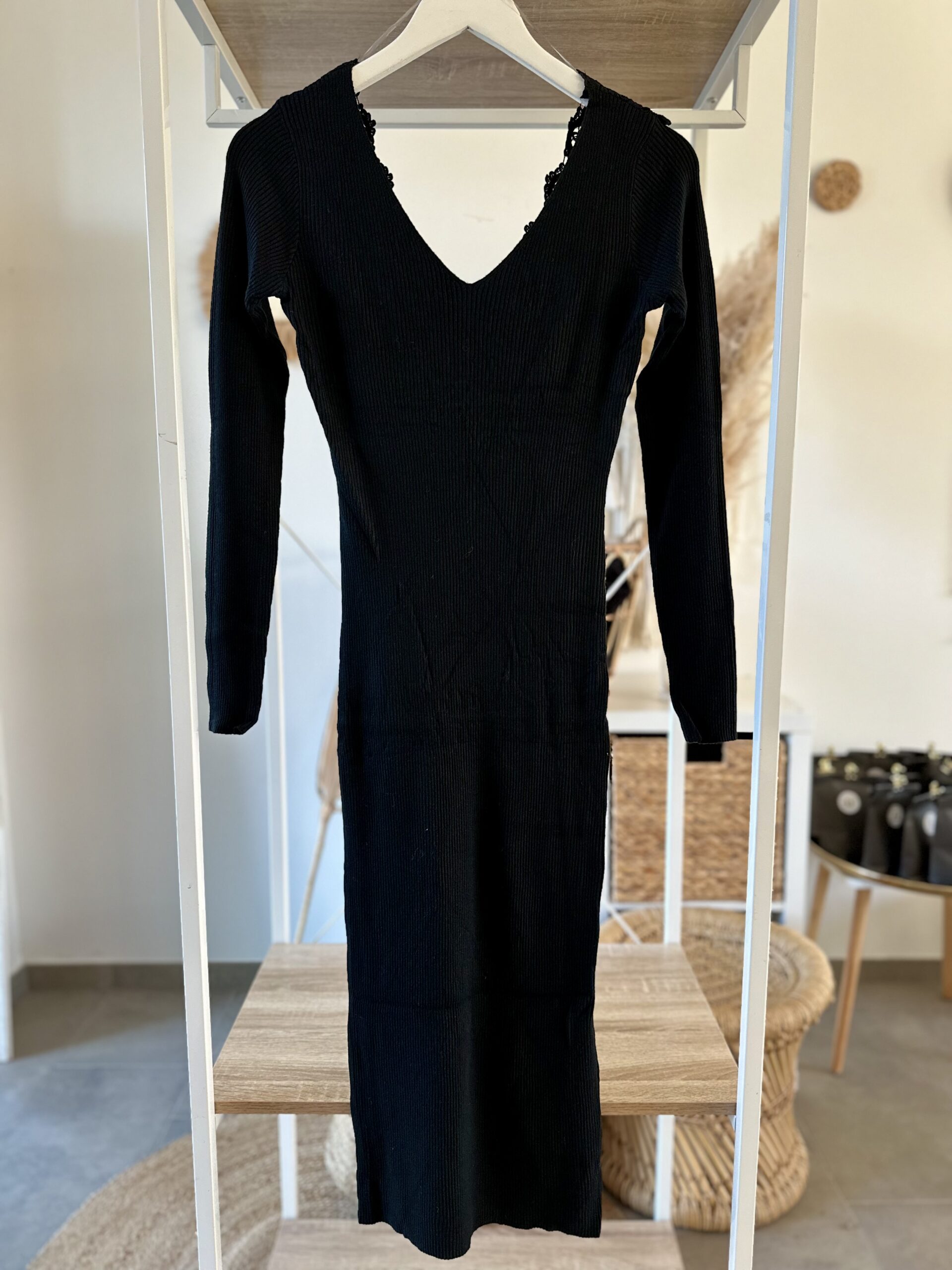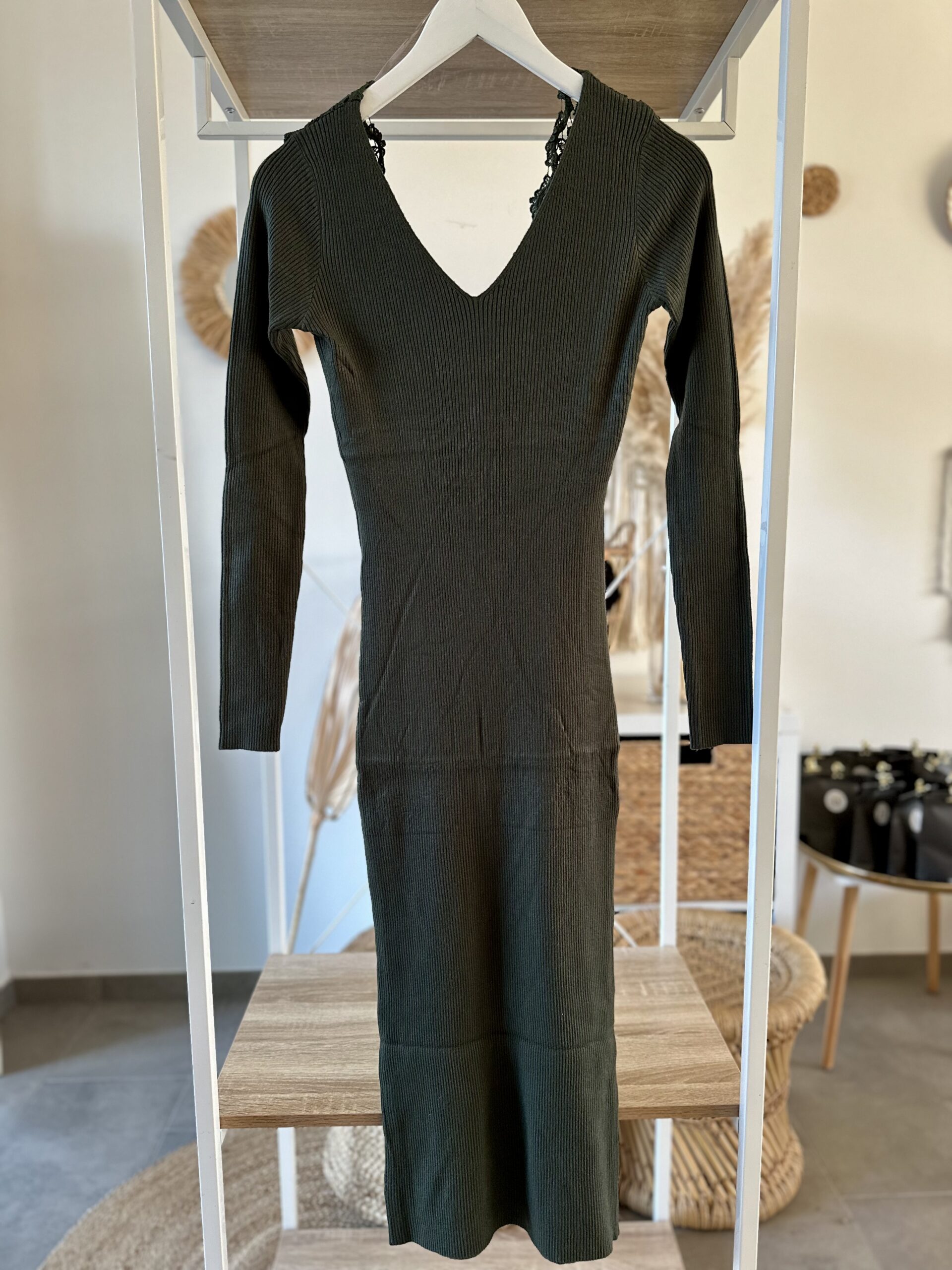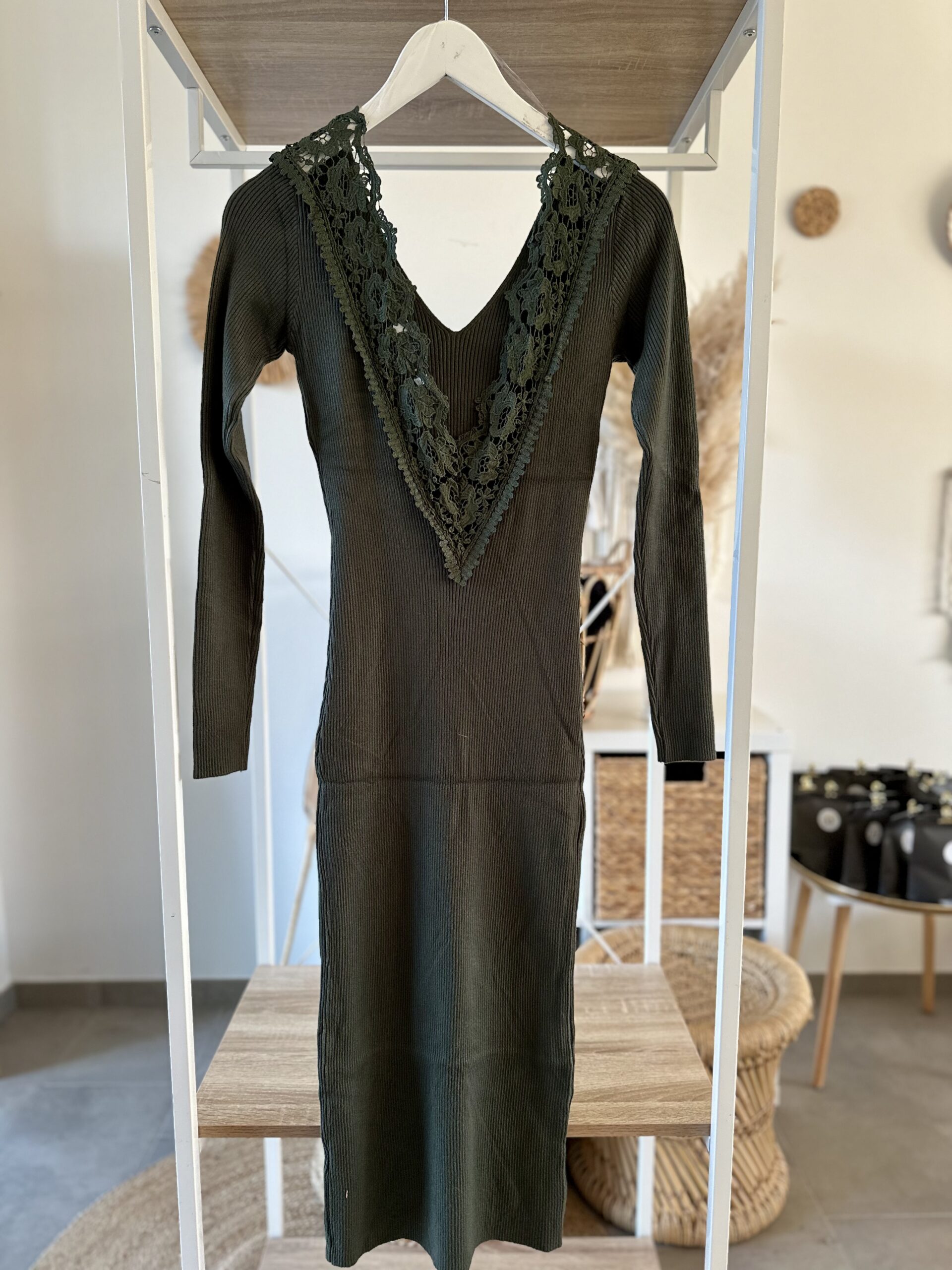 Dieses Kleid begeistert mit feinem Rippstrick, schmeichelnder Silhouette und wunderschöner Spitzenkante im V-Ausschnitt.