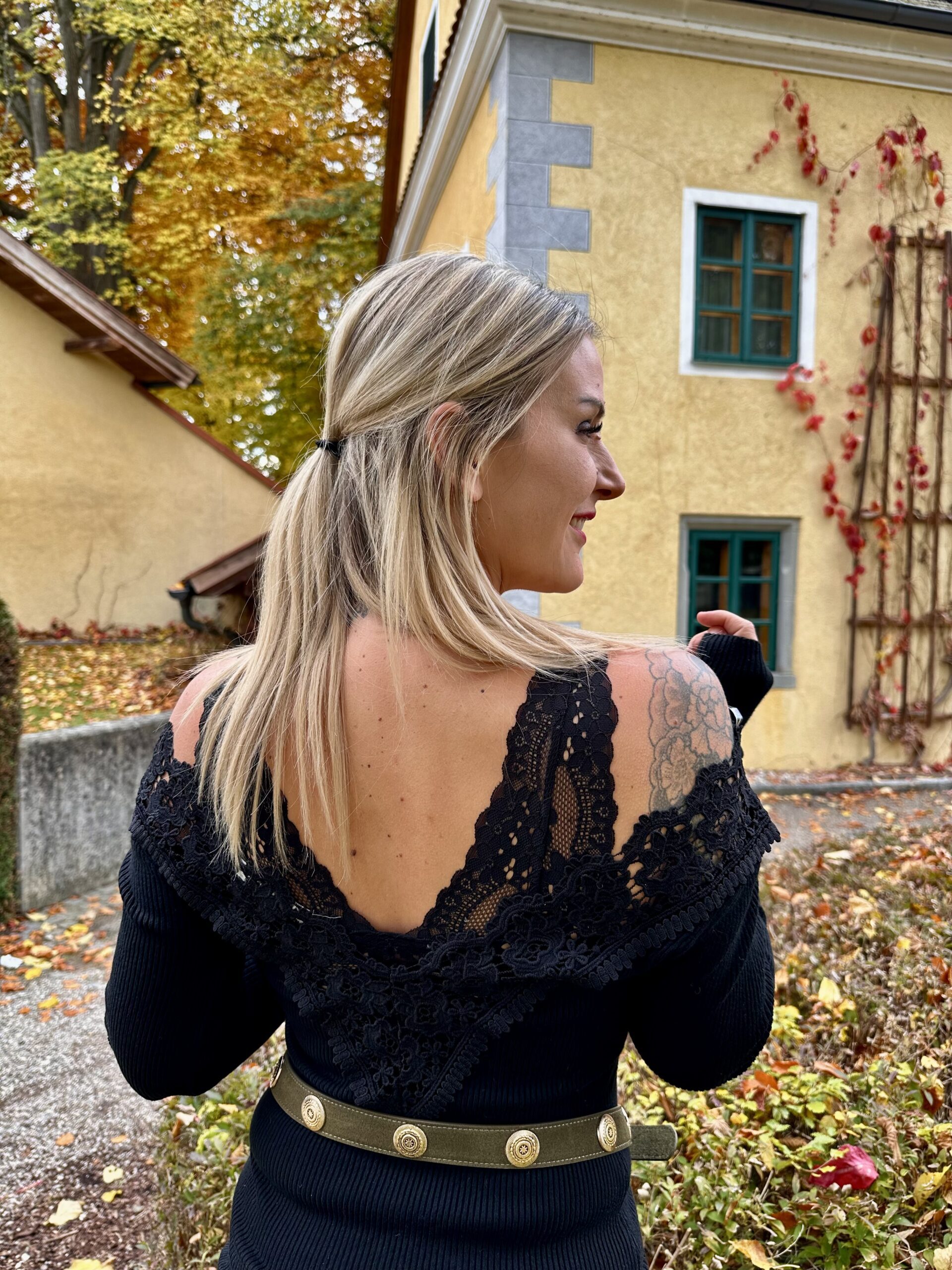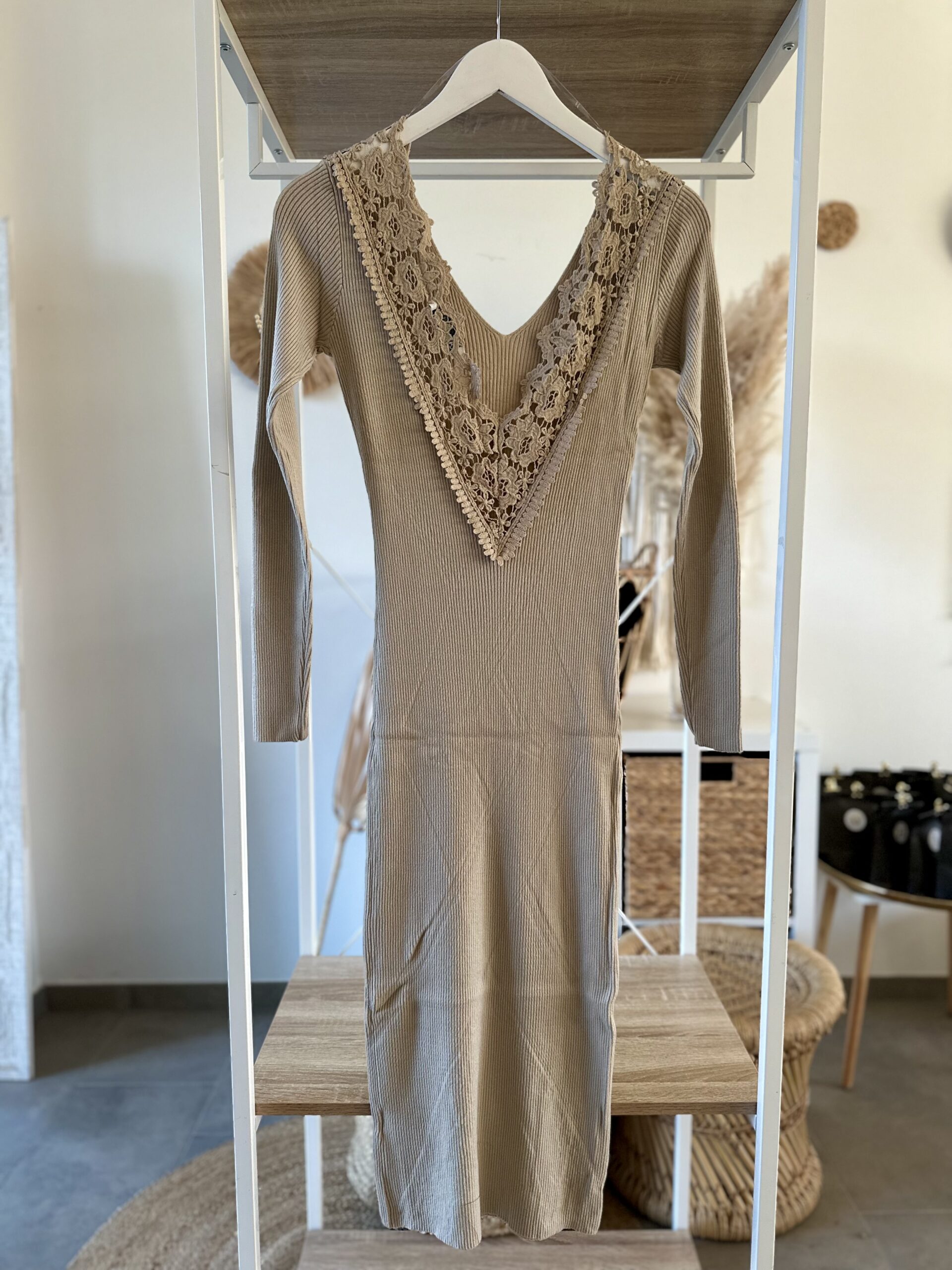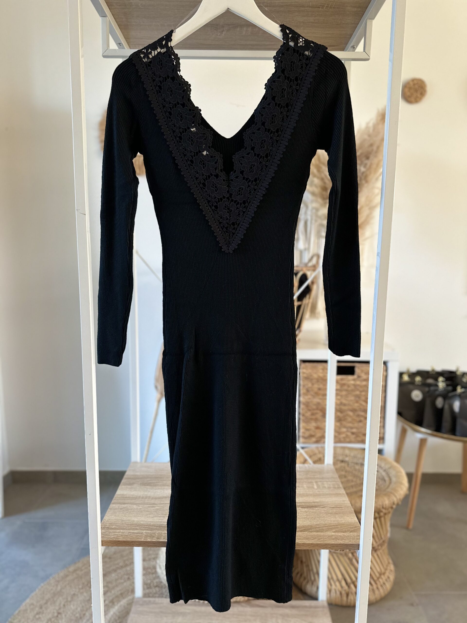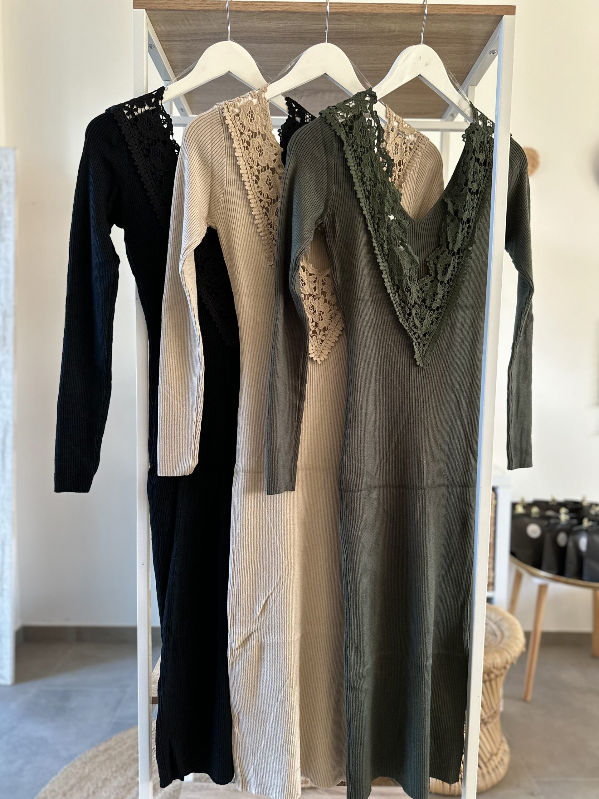 Dieses Kleid begeistert mit feinem Rippstrick, schmeichelnder Silhouette und wunderschöner Spitzenkante im V-Ausschnitt.