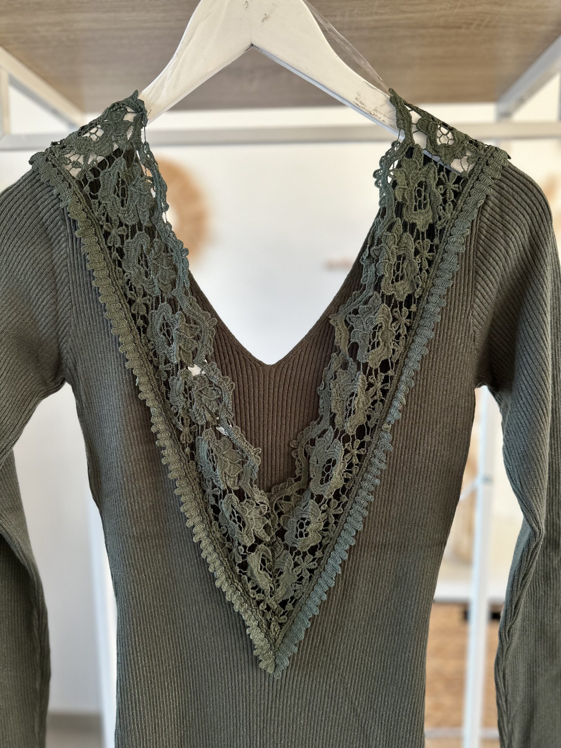 Details: V-Ausschnitt mit Spitzenbesatz, Rippstrick, leicht elastisch