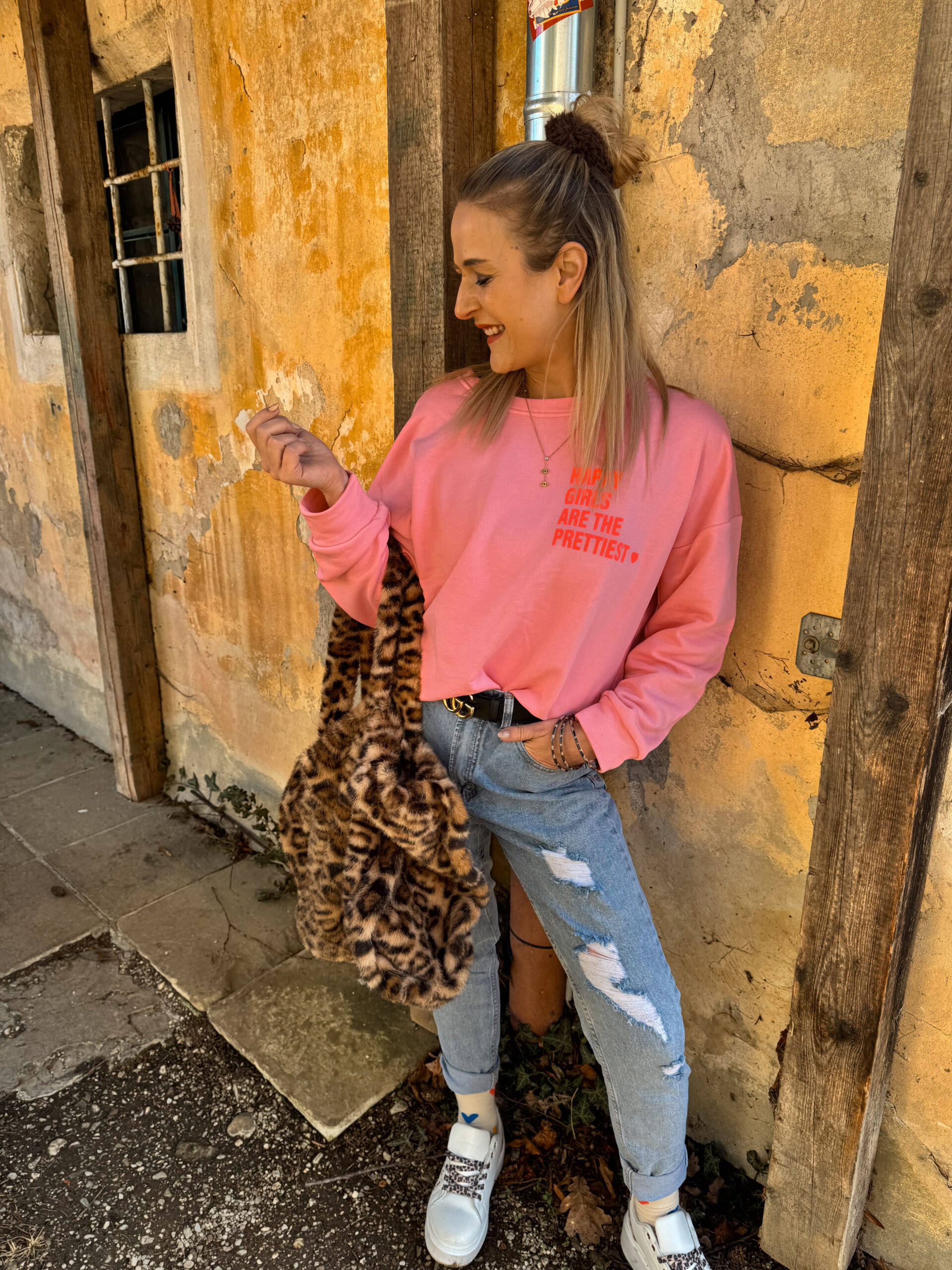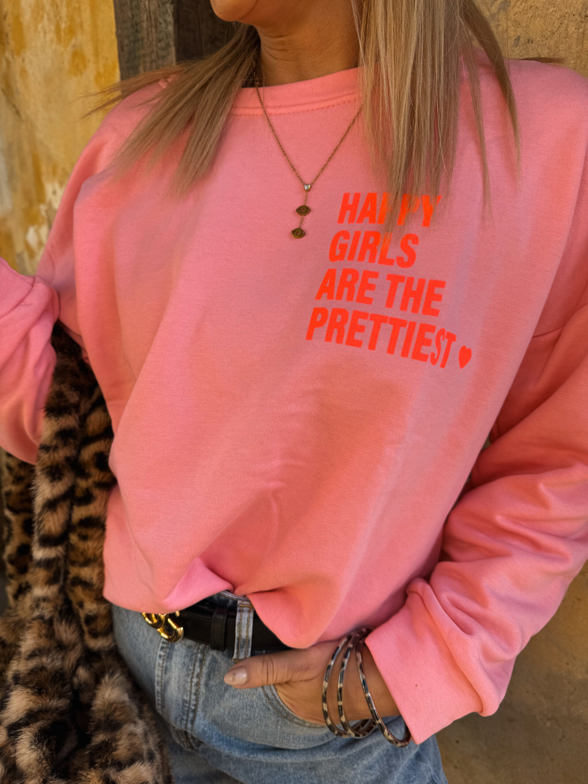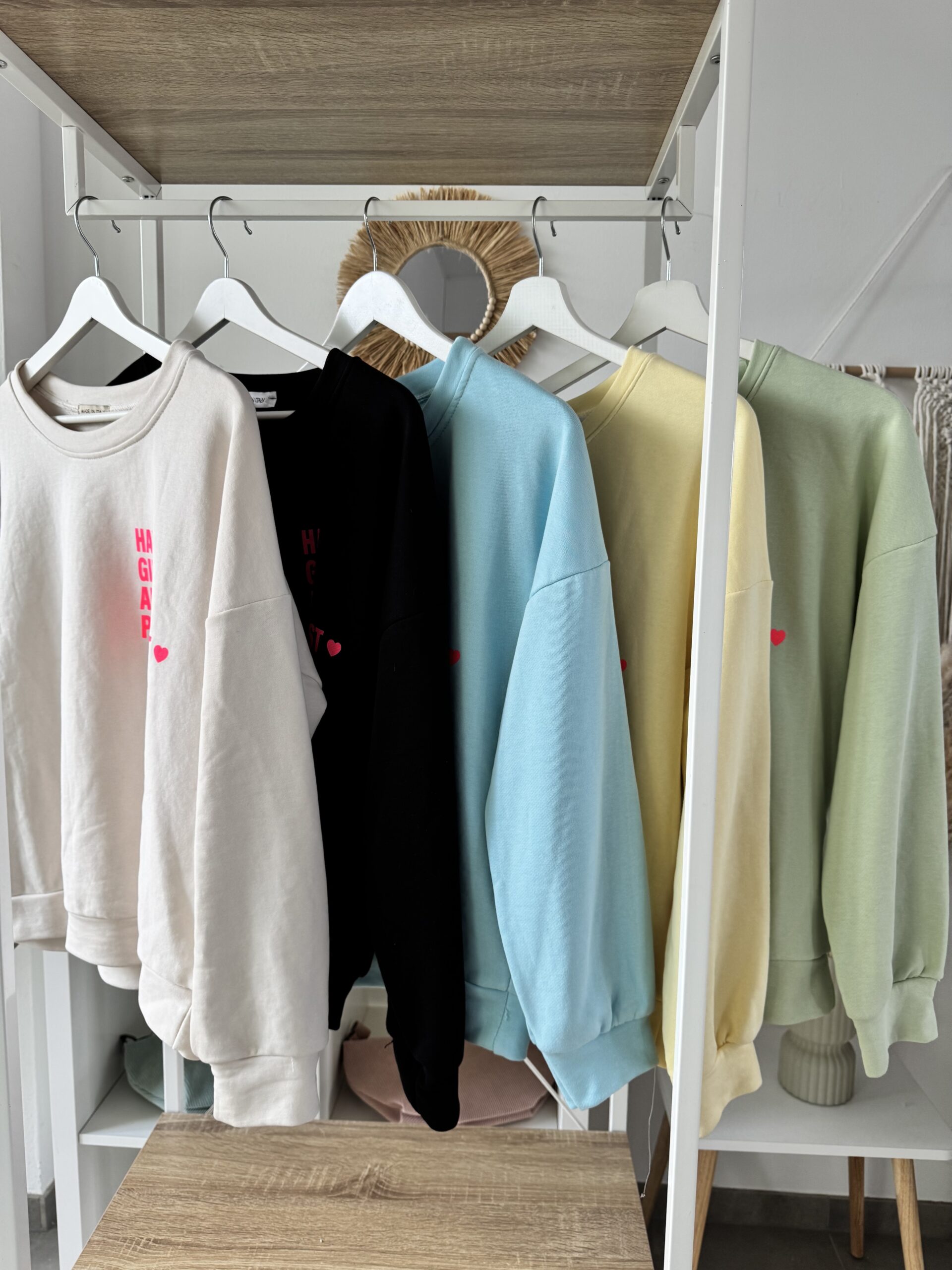 Dieser Sweater ist mehr als nur ein Basic – er ist ein Gefühl. Die leuchtende Statement-Schrift in Neon-Pink setzt ein klares Zeichen für Selbstliebe, gute Vibes und starke Energie.